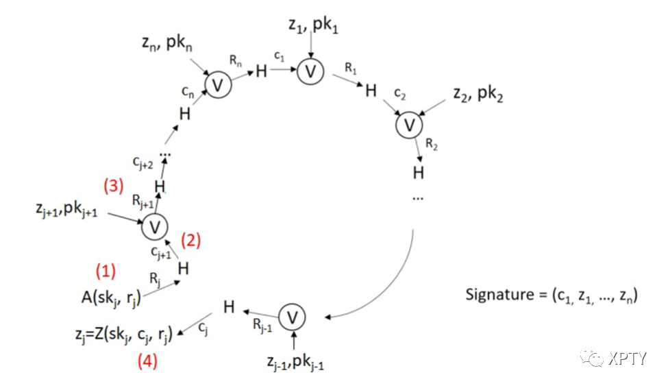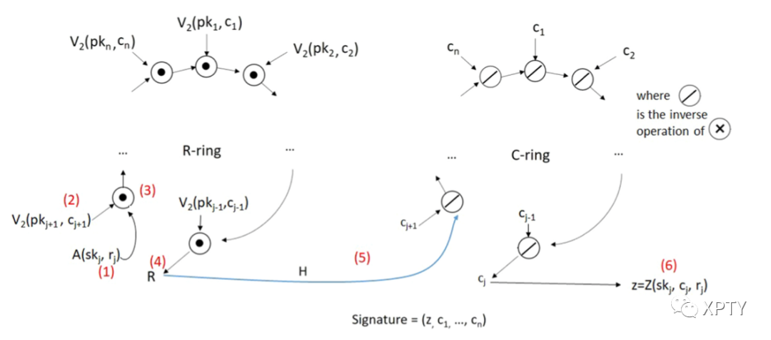 After that, the signer forms a C-ring using the group operation , where the "missing" challenge (5) is computed as: