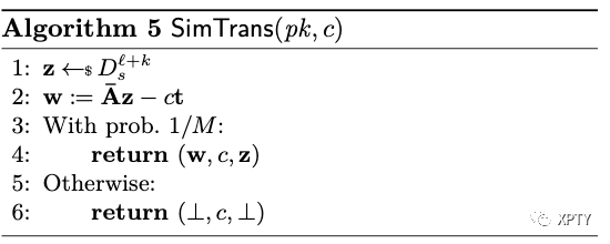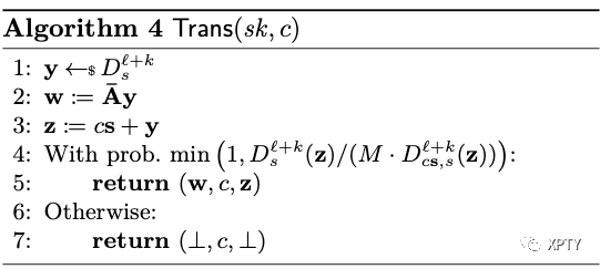We now present a supporting lemma which is required for Dilithium-G to be UF-CMA secure. This is almost a direct consequence of Lemma 2 and a similar result appears in [KLS18, Lemma 4.3] to prove the security of Dilithium signature instantiated with the uniform distribution. We remark that the simulator in Algorithm 5 can only simulate transcripts of non-abort executions in the underlying interactive protocol; in fact, if Trans output in case of rejection as it's done in the interactive protocol then there is no known method to simulate the joint distribution of (without assuming some ad-hoc assumptions like rejection-DCK or rejected-LWE [FH20]).