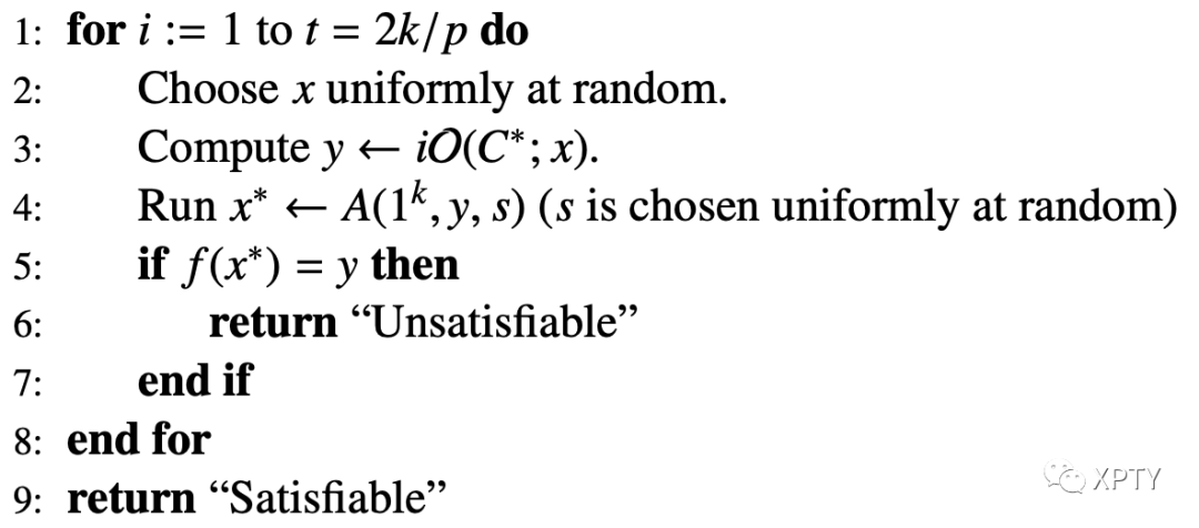 If is unsatisfiable, then it implements the constant zero function. Hence, by Claim 1 it follows that the condition in line 5 will be true with probability independently in each iteration (since we choose and s uniformly at random and independently in each iteration of the loop). The probability that it fails in all iterations is which is negligible. Thus, in this case the algorithm will return "Unsatisfiable" with all but negligible probability.