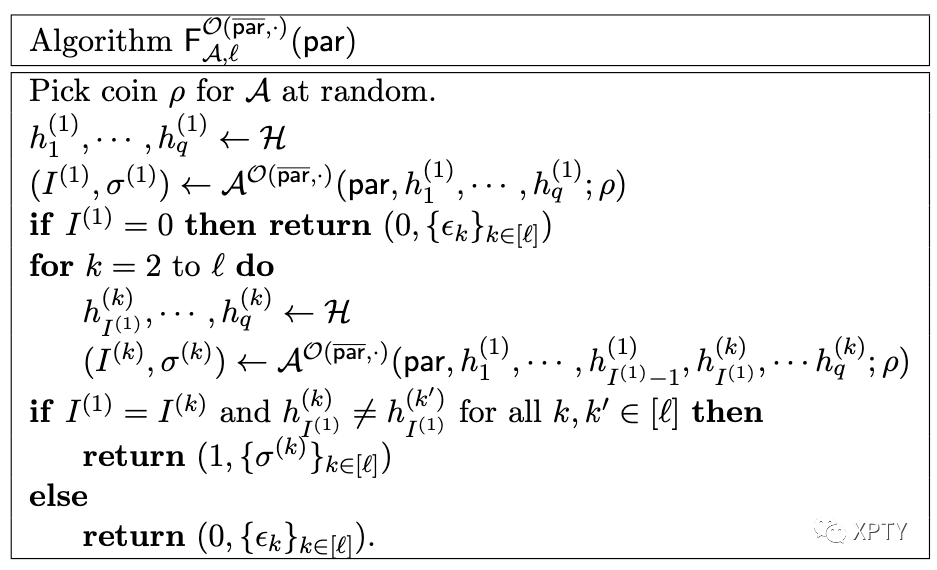 For a positive integer , the forking algorithm associated to is a randomized oracle algorithm that takes input and proceeds as below, where denotes an arbitrary set of strings. Let