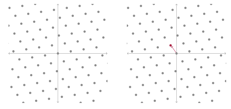思考格的一个好方法是先思考向量空间,它是所有可能向量的集合,这些向量可以通过对一组向量(通常称为基)进行线性组合而得到。如果这些向量是线性无关的(即任何一个向量都不能通过组合其他向量而生成),且有足够多的向量,那么你甚至可以张成整个空间: