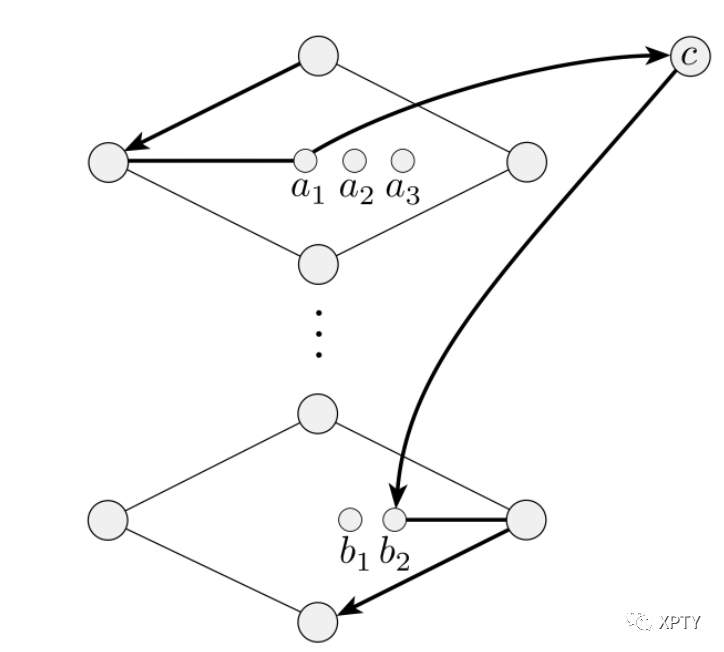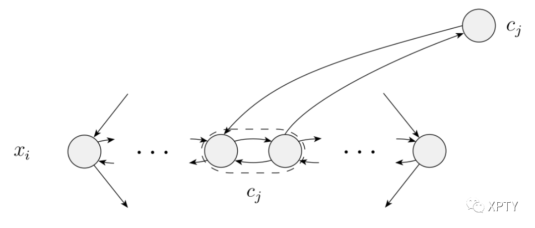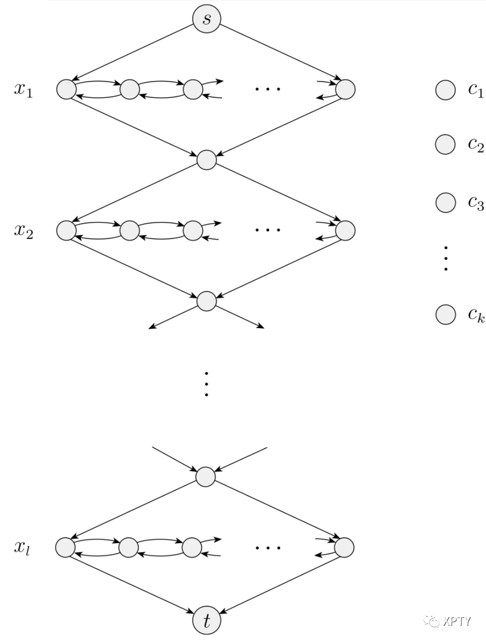 The following figure depicts the global structure of It shows all the elements of and their relationships, except the edges that represent the relationship of the variables to the clauses that contain them.