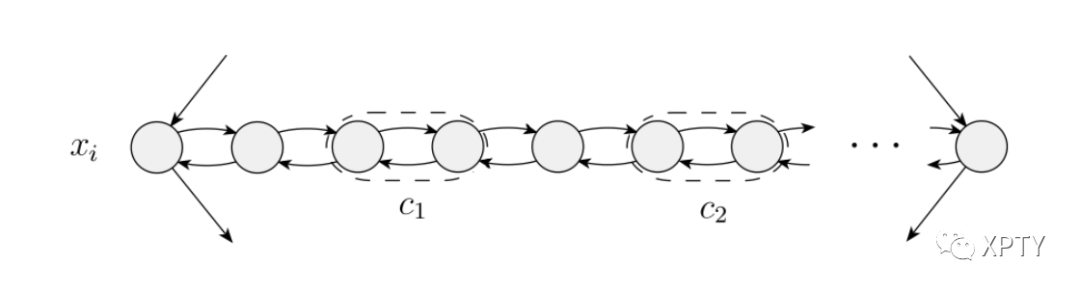Next, we show how to connect the diamonds representing the variables to the nodes representing the clauses. Each diamond structure contains a horizontal row of nodes connected by edges running in both directions. The horizontal row contains nodes in addition to the two nodes on the ends belonging to the diamond. These nodes are grouped into adjacent pairs, one for each clause, with extra separator nodes next to the pairs.