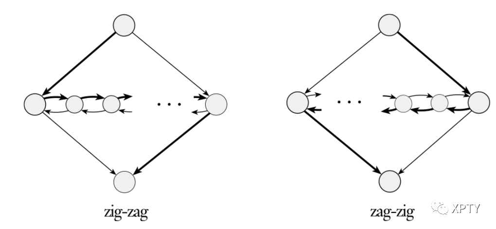 If we selected in clause we can detour at the th pair in the th diamond. Doing so is possible because must be TRUE, so the path zig-zags from left to right through the corresponding diamond. Hence the edges to the node are in the correct order to allow a detour and return.