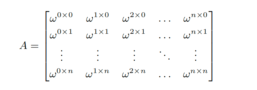 根据公式(2)可知,根据多项式的点值求出多项式系数,将该式同时左乘即可得到多项式系数。通过对范德蒙矩阵求逆可得: