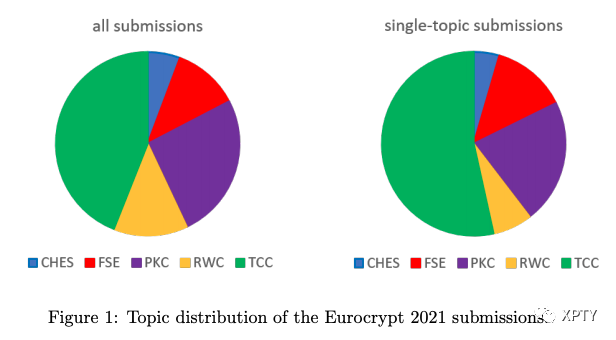 The first task of program chairs is to assemble a Program Committee (PC), which turns out to be challenging. A first reason is that a good PC should be able to review submissions on many different topics with confidence. For this purpose, we relied on the IACR main areas (CHES, FSE, PKC, RWC and TCC) and tried having PC members coming these different fields. But the distribution of the submissions per topic is typically unbalanced. For example, we plot such a distribution for Eurocrypt 2021 in Figure 1.