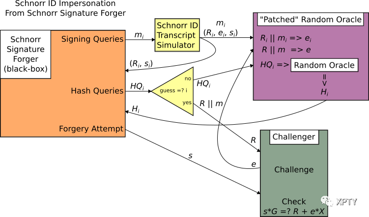于是自然想到在签名生成时需要使得依赖,从而避免掉上述敌手的伪造攻击路径。一种建立依赖的方法就是修改为。如此一来随机选取后,找到满足方程的将会变得非常困难(没有比暴力尝试更好的算法)