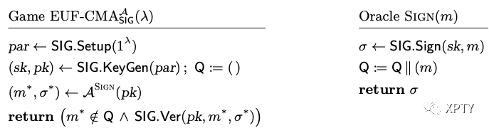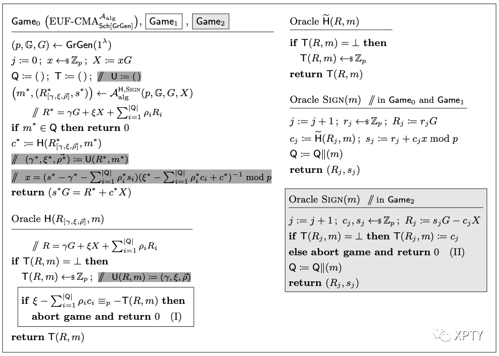and are identical unless returns 0 in line (II). For each signature query, is uniformly random, and the size of table is at most , hence the game aborts in line (II) with probability at most By summing over the at most signature queries, we have