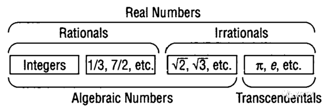 Turing's paper (and this book) restricts itself to real numbers (not imaginary numbers), and the following diagram summarizes the most important categories within the realm of the reals: