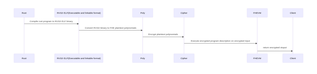步骤 1 由 Rust 编译器开箱即用地提供。步骤 2 只是解析 ELF 文件、解码指令,并将指令编码为 FHE 明文多项式。步骤 3 是简单的加密,步骤 5 是平凡的——将输出密文发送回客户端。
