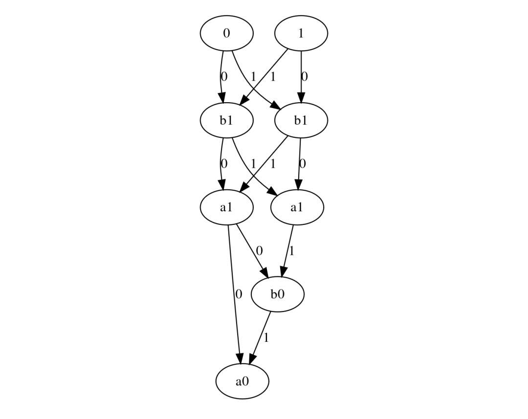 上图是 2 位加法器 BDD,但是反转的。从终端节点开始,我们迭代地折叠每个节点的入边(即如果节点的位值为 0 则选择标记为 0 的那个,否则选择标记为 1 的那个),直到最后一个节点(即 BDD 的根节点)。输出是最后一个节点选择的输出。我们将反转的 BDD 称为 BDD 电路。