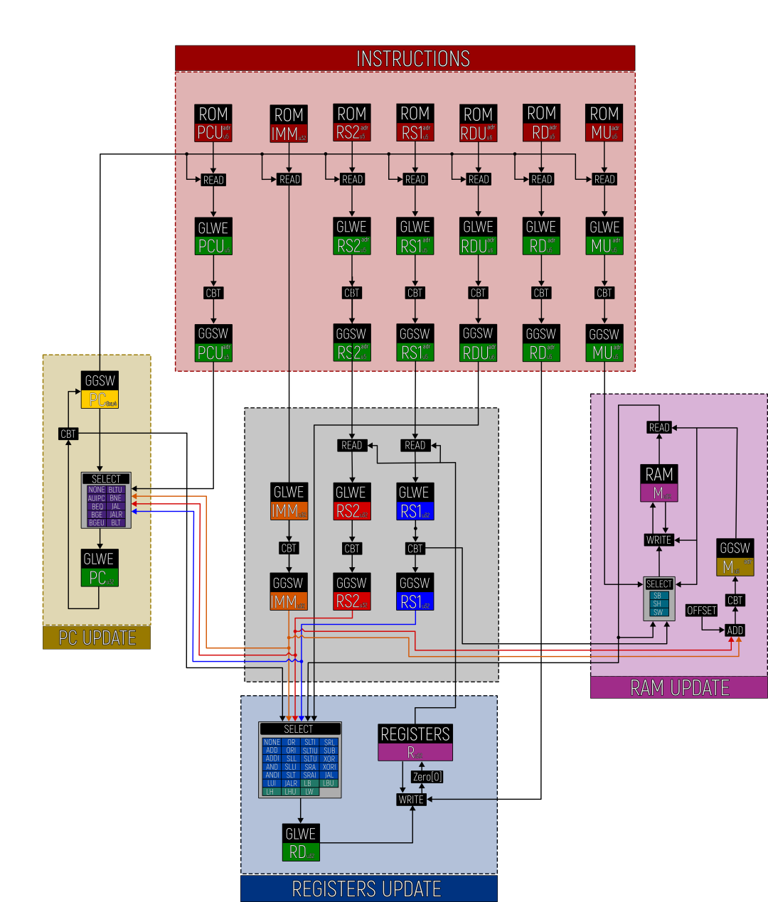 [x0,...,x31],每个 32 位大小。x0 始终为 0,所有对 x0 的写入都被忽略。总结一下,一个周期: