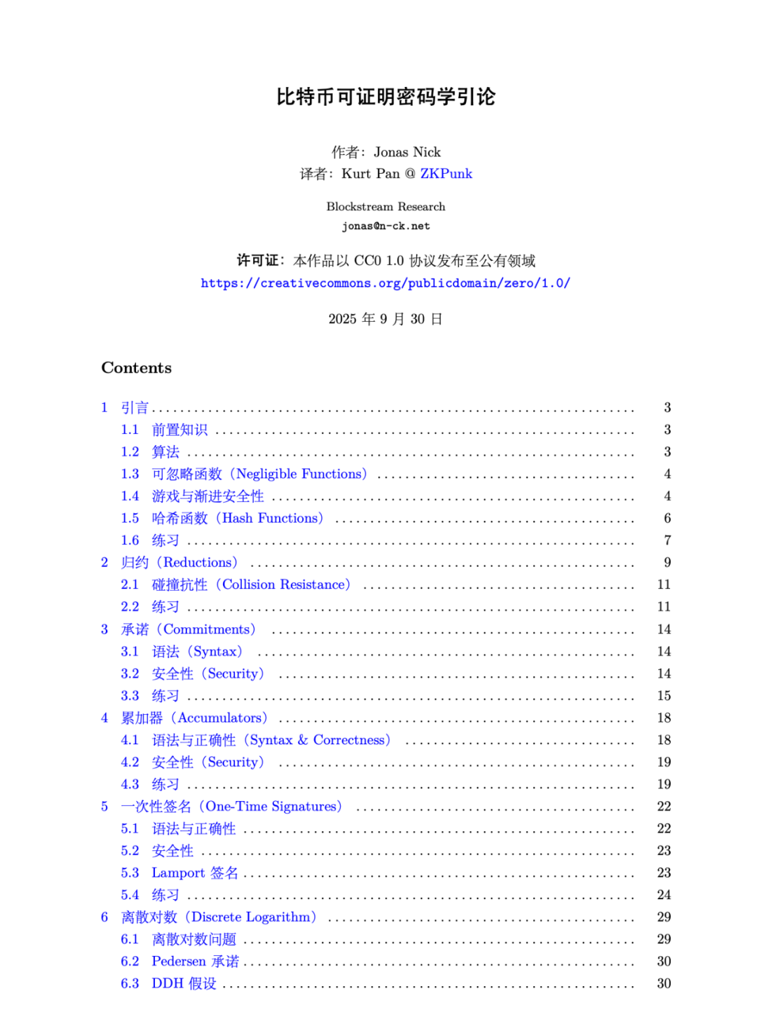 该练习册涵盖了比特币密码学中的选定主题:简介(算法、可忽略函数、游戏与渐近安全、哈希函数)、归约、承诺、累加器、一次性签名、离散对数、随机预言模型、可编程 ROM 和分叉引理、签名、带密钥调整的签名。