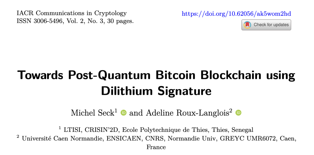 Michel Seck and Adeline Roux-Langlois, Towards Post-Quantum Bitcoin Blockchain using Dilithium Signature. IACR Communications in Cryptology, vol. 2, no. 3, Oct 06, 2025, doi: 10.62056/ak5wom2hd.