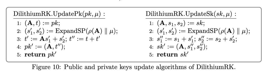 关键是从随机种子ρ确定性派生 并维持安全性。UpdatePk算法接收公钥 和参数ω,通过SHAKE256派生小向量 ,确定性展开矩阵A,重构 (此处丢失 精度),计算 ,最后用Power2Round重新分割得到 。