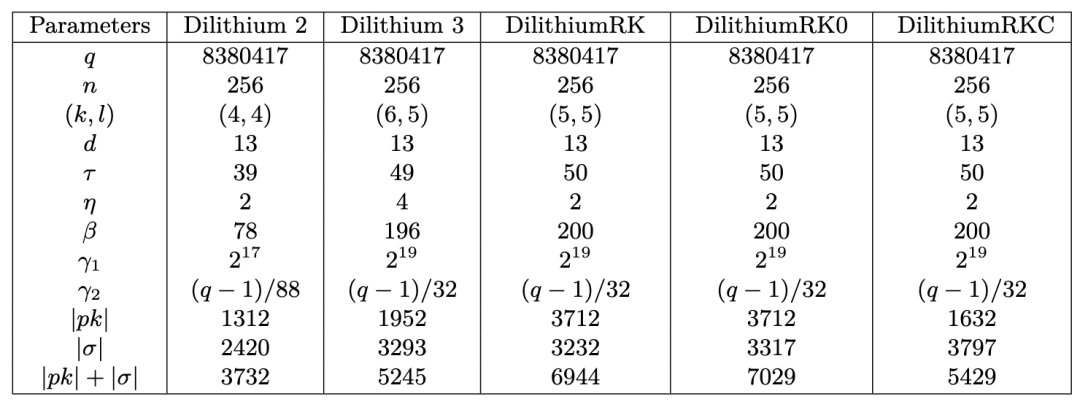 DilithiumRK(标准): 优化参数,公钥1472字节,签名2701字节。
