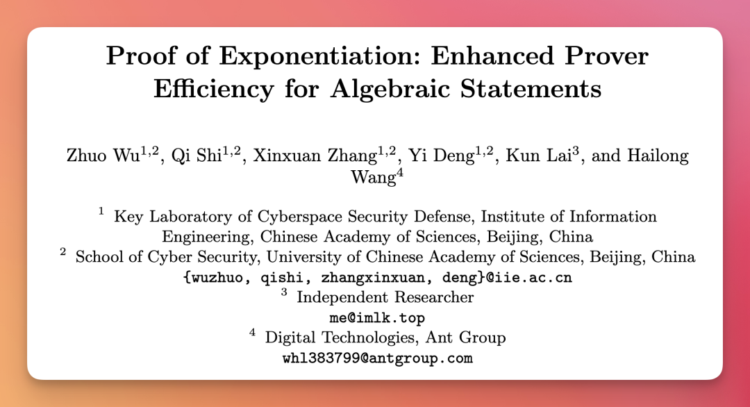 本论文针对在小素域上构造的 zkSNARKs (例如 Goldilocks 域、小梅森素数域及二进制塔域)在证明代数语句(如 RSA 或 ECDSA 签名验证)时效率低下的问题,提出了带指数门的算术电路模型及基于该模型的Hash-committed Commit-and-Prove (HCP) 框架,有效地将大数和椭圆曲线指数运算“脱出”SNARK 电路,转而使用仅与安全参数相关的轻量级哈希运算,大幅度提升证明者效率,同时维持同等水平的证明大小与验算开销 。