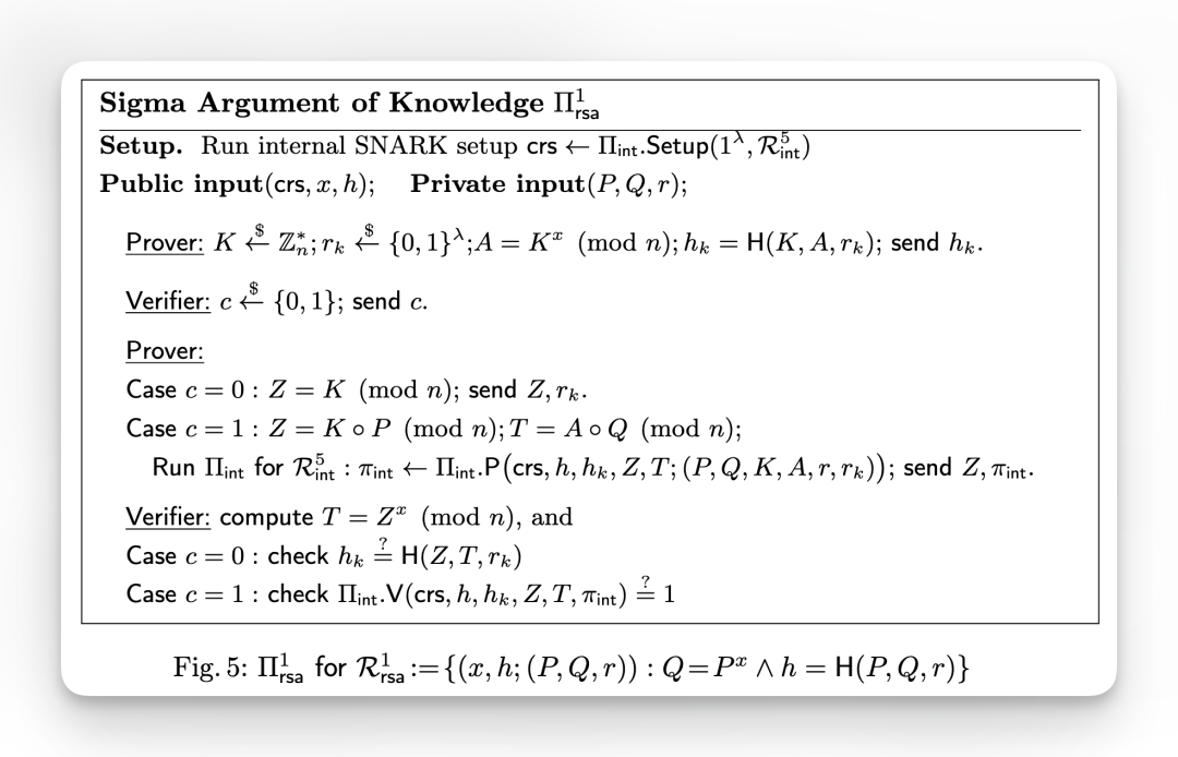 在 Sigma 协议层面,通过Sigma Argument of Knowledge (AoK) 证明对数知识或 RSA 指数知识。