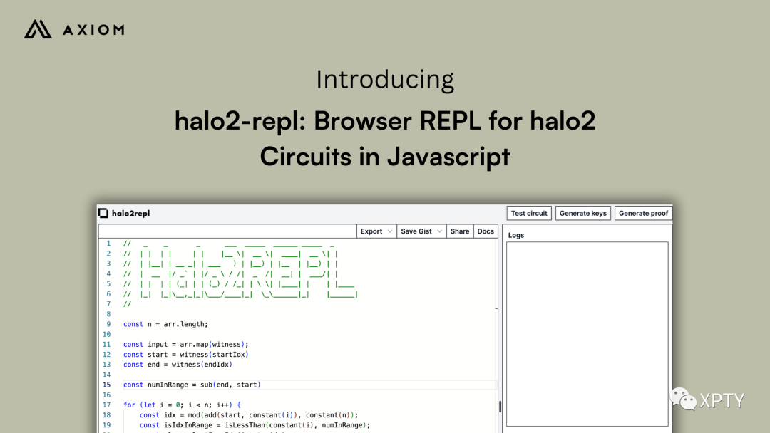 今天我们发布了 halo2-repl,这是一个基于浏览器的用 Javascript 写 halo2 的REPL。开发者可以只用标准 Javascript 写 ZK 电路,而无需学习 Rust 等新语言、安装证明库或管理依赖。用 halo2-repl 写的 ZK 电路可以直接在浏览器中编译和验证,意思是你可以立即开始使用 ZK了。我们还在当前版本中包含了一个小电路谜题作为默认电路 - 试着写一个电路来解决该谜题,并将你的解决方案通过 @axiom_xyz 发送给我们!