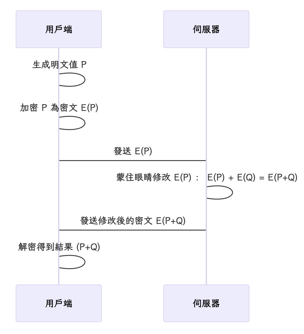 举例来说,对于加法:你拥有未知的数值 ,并把已知数值 加到 上。你可以推断结果是 ,但你不知道 是多少,也不知道 是多少。用户端再用自己的密钥将结果解密,得到 。由于用户端也知道 的值,它就能逆向计算出 。