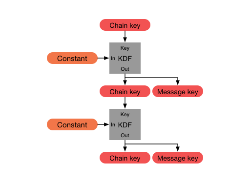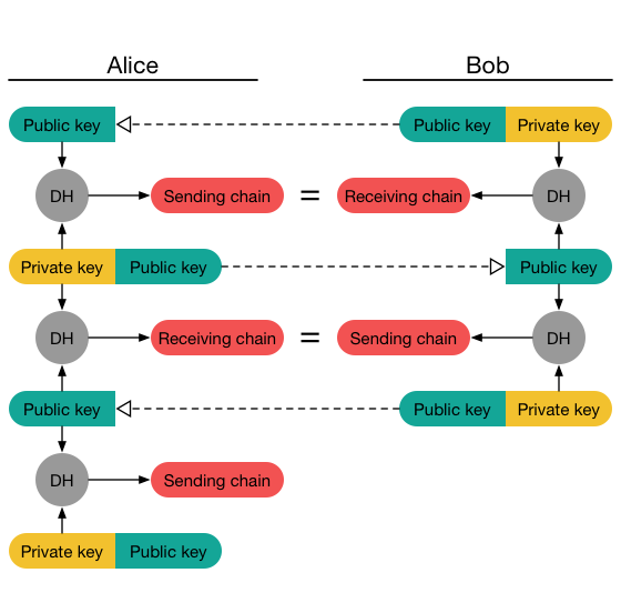 Diffie-Hellman棘轮在发送的每条消息中合并一个新的ECDH公钥。使用Alice和Bob——解释非对称加密时经常提到的虚构角色——当Alice向Bob发送消息时,她创建一个新的棘轮密钥对,并计算此密钥与Bob发送的最后一个棘轮公钥之间的ECDH协议。这给了她一个新的秘密,她知道一旦Bob得到她的新公钥,他也会知道这个秘密(因为如前所述,Bob之前发送了另一个密钥)。有了这个,Alice可以将新秘密与她的旧根密钥混合以获得新的根密钥并重新开始。结果是:了解她旧秘密的攻击者将无法区分她的新棘轮密钥和随机噪声。