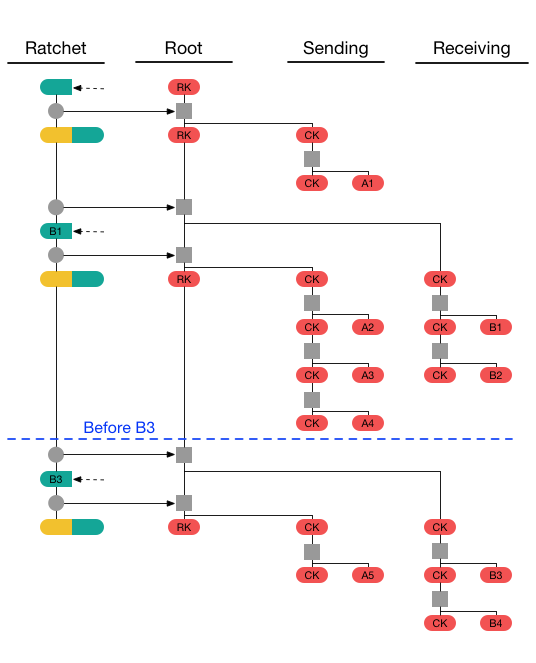双棘轮的第一层,对称棘轮,从根密钥派生出AES密钥,并为发送的每条消息推进它。这允许每条消息都用新的密钥加密。因此,如果攻击者泄露了一方的设备,他们将无法了解之前密钥的任何信息。但即便如此,攻击者仍然能够计算未来消息中使用的密钥。这就是第二个"Diffie-Hellman棘轮"发挥作用的地方。