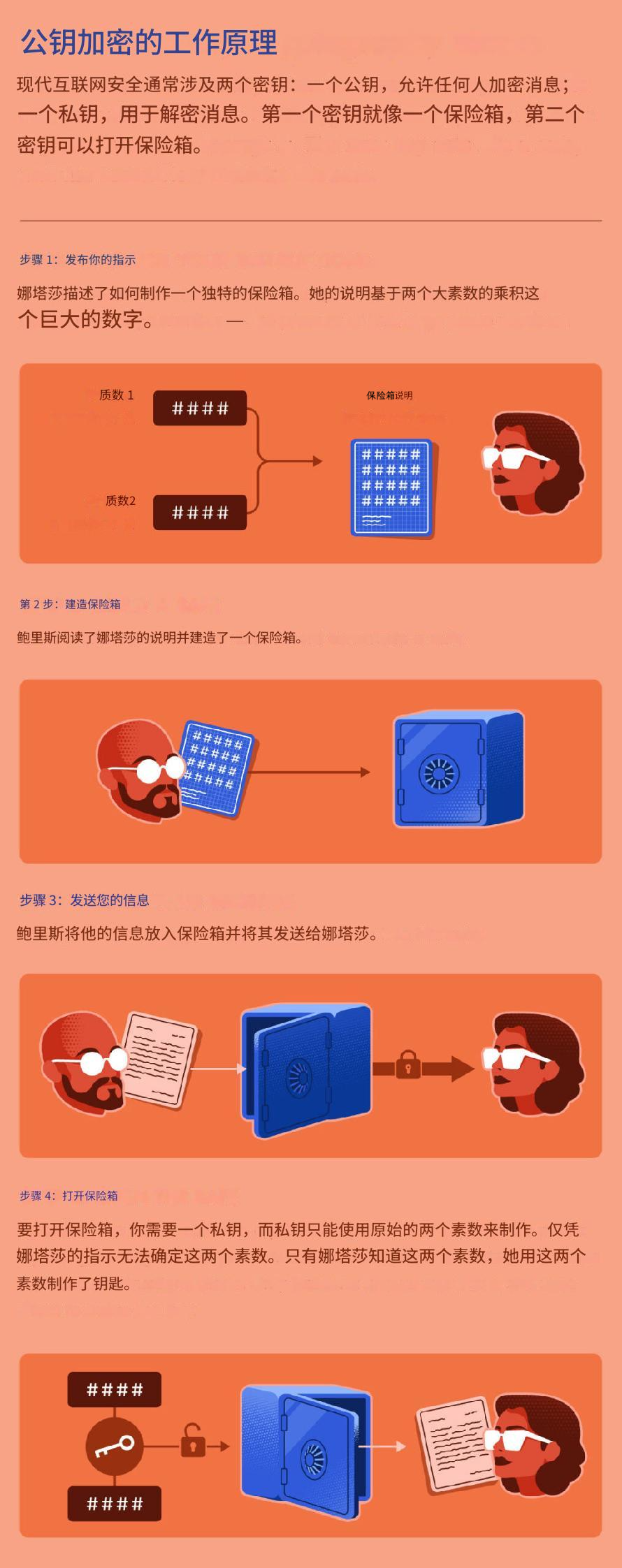 一种反直觉的解决方法,被称为公钥加密,不依赖于保持密钥秘密,而是反而依赖于使其广泛可获得。技巧在于还要使用第二把你永远不会与任何人(甚至包括你要与之通信的人)分享的密钥。只有通过使用两个密钥的组合(一个公钥,一个私钥),才能对同时对消息进行加扰和解密。