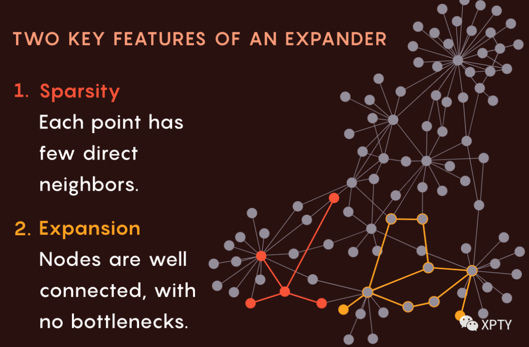 扩展图特殊在于两个看似矛盾的性质。首先,它们是稀疏的:每个节点都连接到相对较少的其他节点。其次,它们具有扩展性(也是扩展图名字的由来),意思是没有任何节点集合可以成为很少有边通过的瓶颈。换句话说,尽管连接是稀疏的,每个节点都与其他节点连接良好。