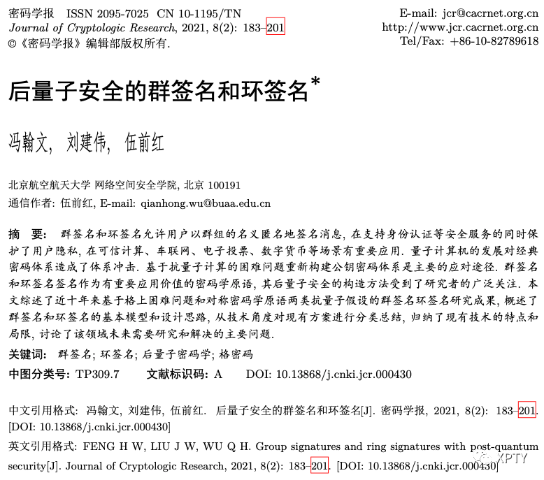 冯翰文, 刘建伟, 伍前红. 后量子安全的群签名和环签名[J]. 密码学报, 2021, 8(2): 183–201. [DOI: 10.13868/j.cnki.jcr.000430]