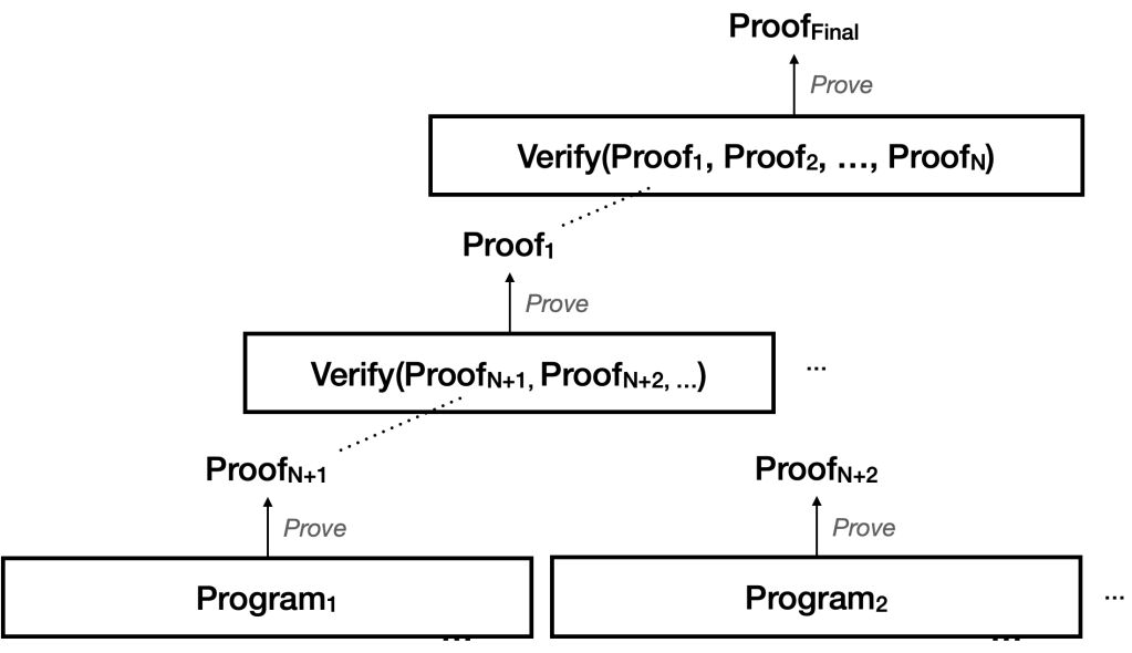 以上是一個遞歸證明使用的例子。在最底層,我們有一些實際程式,每個程式都擁有獨立的證明。接著在上一層,有一個程式專門用來驗證底層的那些證明。而在頂層,又有另一個程式負責驗證第二層所產生的多個證明!(許多程式未予展示。)