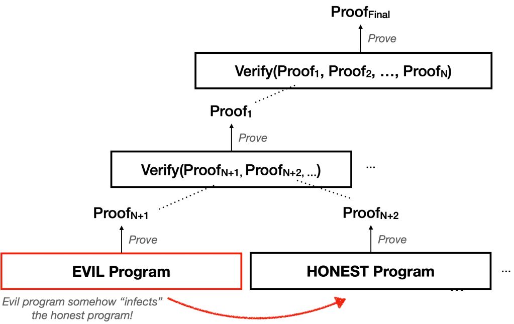 現在,試想一種情況:這種隔離機制並不存在。也就是說,樹中任何一個「程式」中的一個巧妙漏洞,都可能以某種方式使整個證明樹中任何其他程式(證明) 都變得不安全。這就像是將一個惡意程式植入 Linux 系統,然後利用它來攻擊 Linux 內核,進而破壞系統上任何應用程式的安全性。也許這聽起來不太可能?對我來說,這實在是異想天開,但再說一次,我們此刻正處於一個充滿奇想的世界。誰知道未來會有什麼可能性呢!