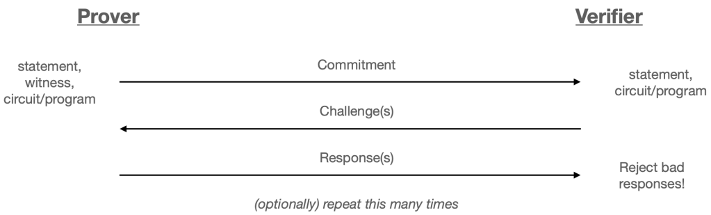 我們今天使用的許多可驗證運算“證明系統”,都屬於一類稱為互動式證明的協議。這些協議中,兩個參與方——證明者與驗證者——通過訊息交換,使得證明者能夠向驗證者證明某一陳述的真實性(例如「我知道一個使特定程式正常運作的輸入 x」,並可能提供輔助證明的見證w)。在許多情況下,這些協議遵循如下形式的互動模式:
