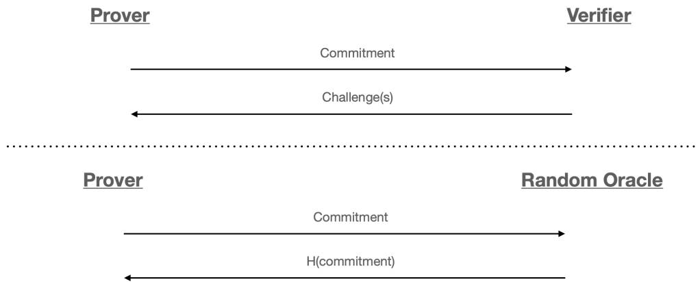 1986年,兩位密碼學家 Amos Fiat 與 Adi Shamir 遇到了一個與此相似的問題。他們當時擁有一個互動式證明系統——當時的系統相對簡單,畢竟那是1980年代——而他們希望將這種互動式證明轉變為任何人都能驗證的非互動式證明。他們曾考慮過上述提及的證明記錄(transcript)的概念,但很快意識到那行不通,因為驗證者可以輕易與證明者串通來幫助其作弊。為了解決這一問題,他們提出了一個既巧妙又簡單的解決方案,同時也開啟了一條至今仍在探索的龐大理論領域。