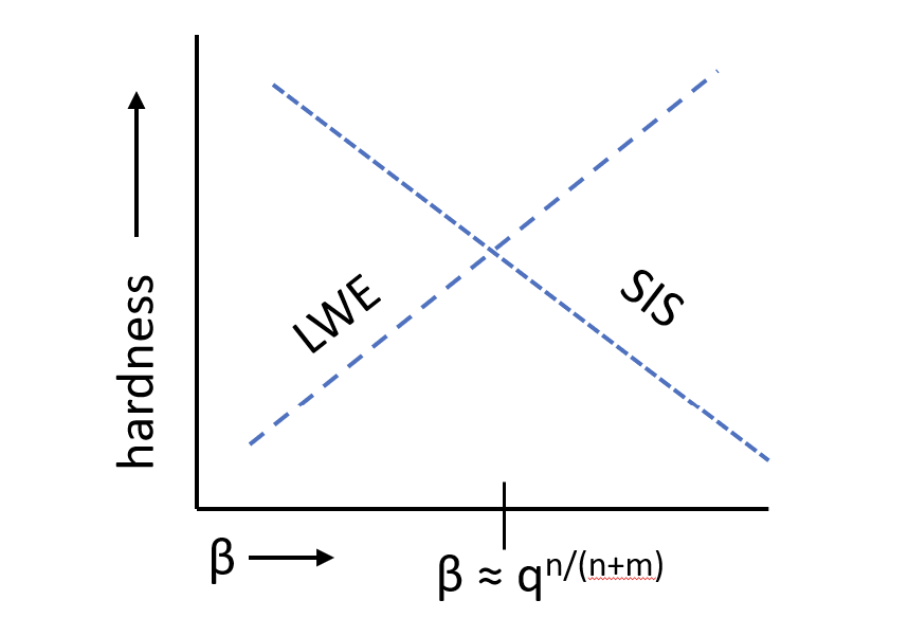 在随机格中找到短向量的问题被称为SIS(短整数解)问题。已知求解这个问题的随机实例至少与求解所有格中的某些相关问题一样困难[Ajt96, MR07]。我们将写为当给定如前文所述随机格时找到系数在中的向量的问题。