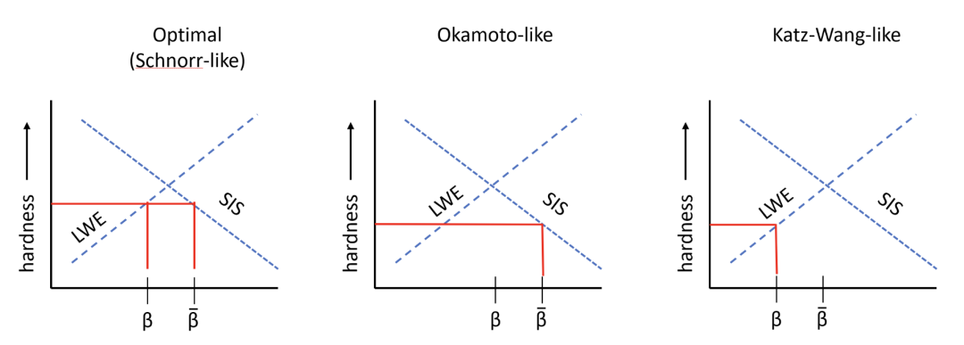 基于格的协议的Okamoto和Katz-Wang类比对参数和引入了一些约束,这些约束导致实例化不如自由选择这些值(受引理10中建立的它们之间的关系约束)时高效。在图2中,我们勾画了LWE和SIS问题的安全性如何基于参数演变。和问题(及其多项式版本)在难度上相遇的交点大约在。图5签名方案参数的最优设置将是和在这个交点的不同侧。然而,在Okamoto型方案中,我们需要设置以使公钥不唯一确定私钥,这使和在同一侧。在Katz-Wang型方案中,我们需要以使用信息论论证,这又使和在同一侧。我们在图7中形象地展示了这一点,这应该给出为什么方案的无约束Schnorr型变体导致最有效参数的直觉。
